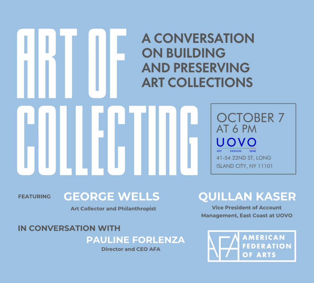 The program will feature George Wells, art collector and philanthropist, in conversation with Quillan Kaser, Vice President of Account Management, East Coast at UOVO. Moderated by Pauline Forlenza, Director and CEO of the AFA, the discussion will explore how to thoughtfully begin an art collection and the ongoing responsibilities of caring for and preserving works for future generations.