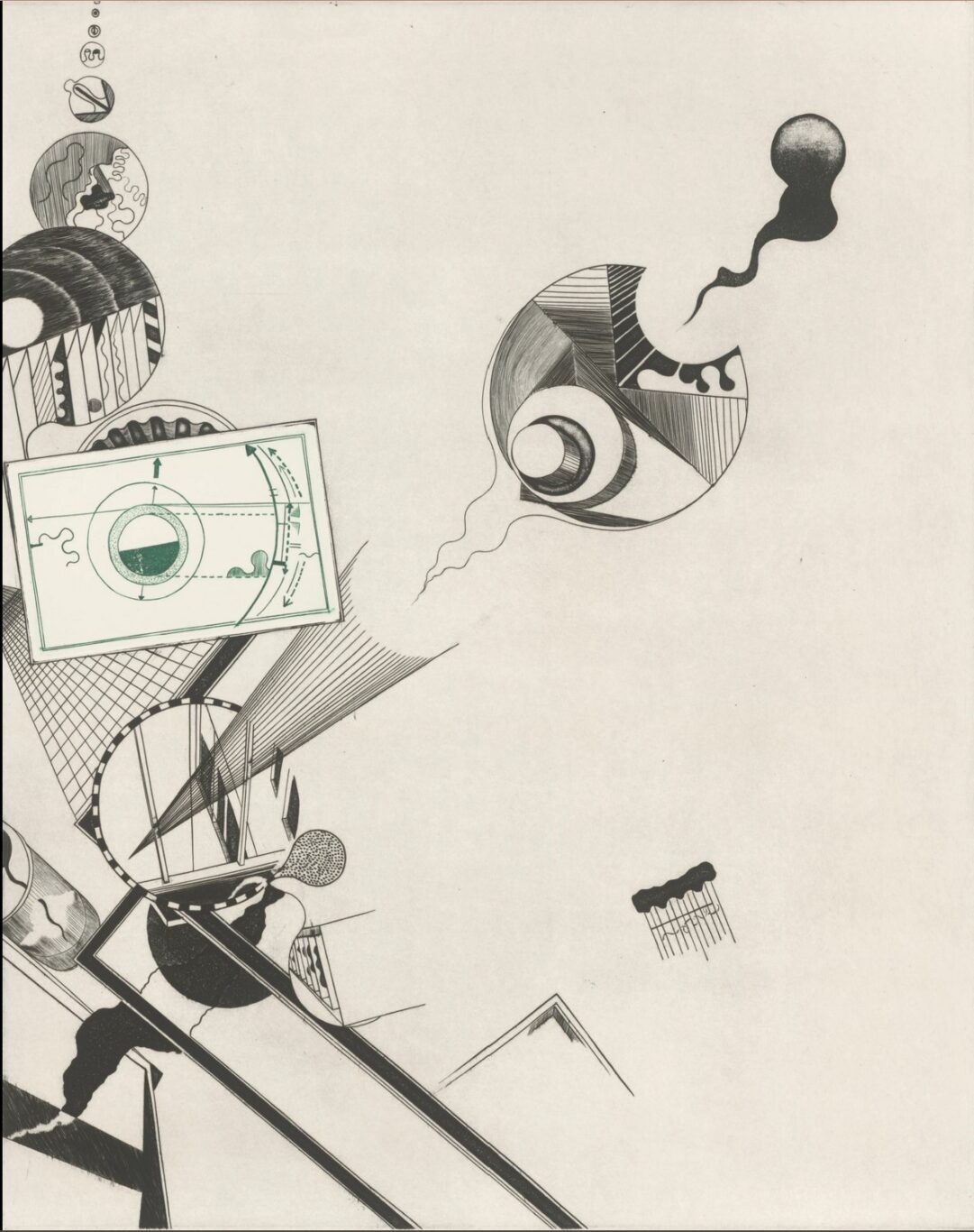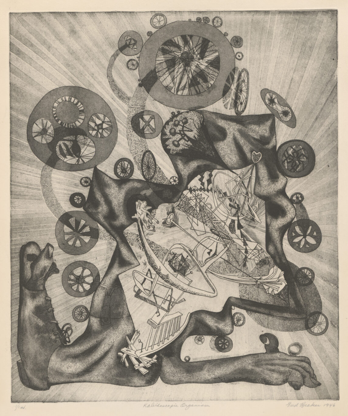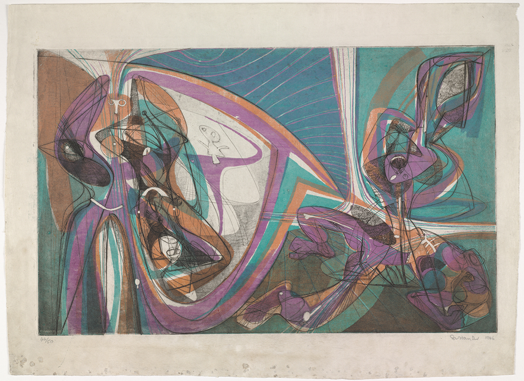 Founded by English artist Stanley William Hayter (1901–1988), this studio attracted hundreds of international artists drawn to Hayter’s radical vision of printmaking as a mode for experimentation rather than reproduction. Artists at Atelier 17 employed a range of intaglio print methods, including engraving, drypoint, and etching. The prints in the exhibition also showcase some of the techniques that artists developed at the studio, including: softground etching for transferring textures; printing in plaster to proof prints without the press; and simultaneous color printing. These advancements reveal how artists broke new ground in graphic media at the studio and often crossed into other disciplines.