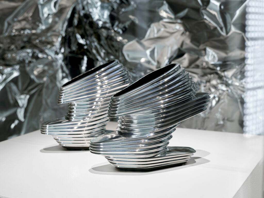 Future Now features around sixty futuristic designs from the Bata Shoe Museum’s holdings as well as loans from prominent institutions, collectors, designers, and inventors. It explores how cutting-edge technologies, unexpected materials, and new ideas are transforming footwear today. The exhibition includes digitally designed and 3D-printed shoes, sneakers made from mushroom leather and reclaimed ocean plastics, and footwear created for the metaverse.