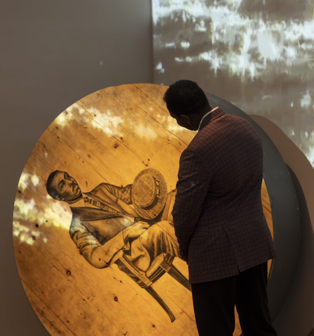 The exhibition opens with Lovell’s immersive, multi-sensory installation Deep River (2013) that documents the perilous journey freedom seekers took by crossing the Tennessee River to “Camp Contraband” in Chattanooga during the Civil War. Three floor-to-ceiling video projections depicting footage of the river accompanied by the sounds of lapping water surround the viewer in the gallery. A soil mound, covered with vintage objects—utensils, pans, lamps, ropes, boots, a Bible, and weapons—is surrounded by fifty-six circular wooden foundry molds, each one bearing a hand-drawn depiction of a nameless African American individual. Deep River is grounded in the African American struggle for freedom during the Civil War and addresses accompanying themes of abandonment, death, life, and hope. However, by portraying the locale in a non-specific way and depicting people from different time periods and socio-economic milieus, Lovell also invites viewers to contemplate the larger human quest for equality and the pursuit of a better life that crosses time and geography.